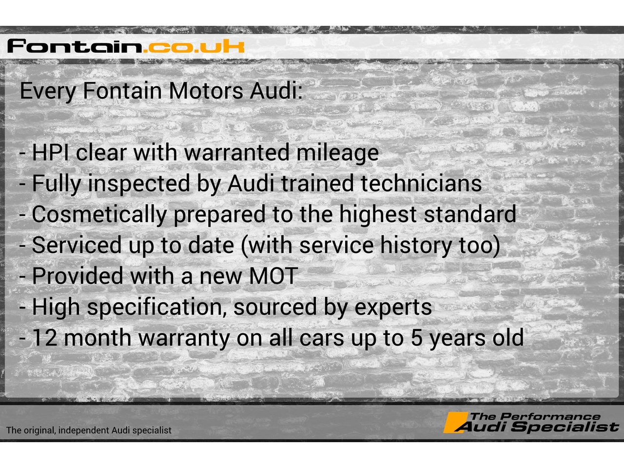 Fontain Motors: The Audi Specialist. the UK's original and best independent specialist Audi dealership established 1995. Finance quotes, part exchanges, detailed specification, service history, and high resolution images all at fontain.co.uk