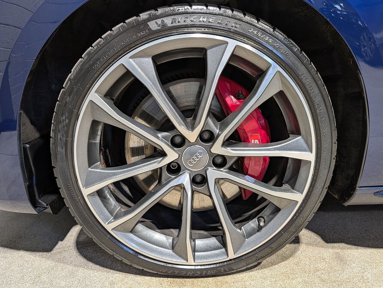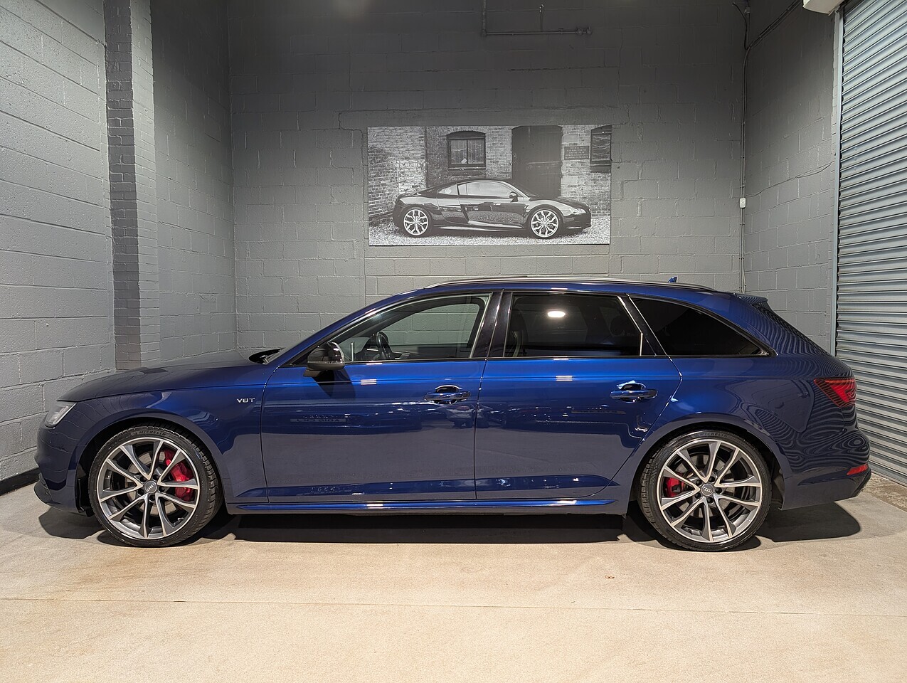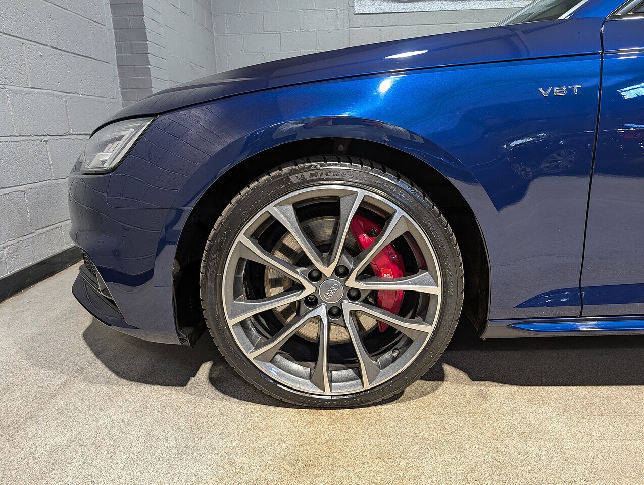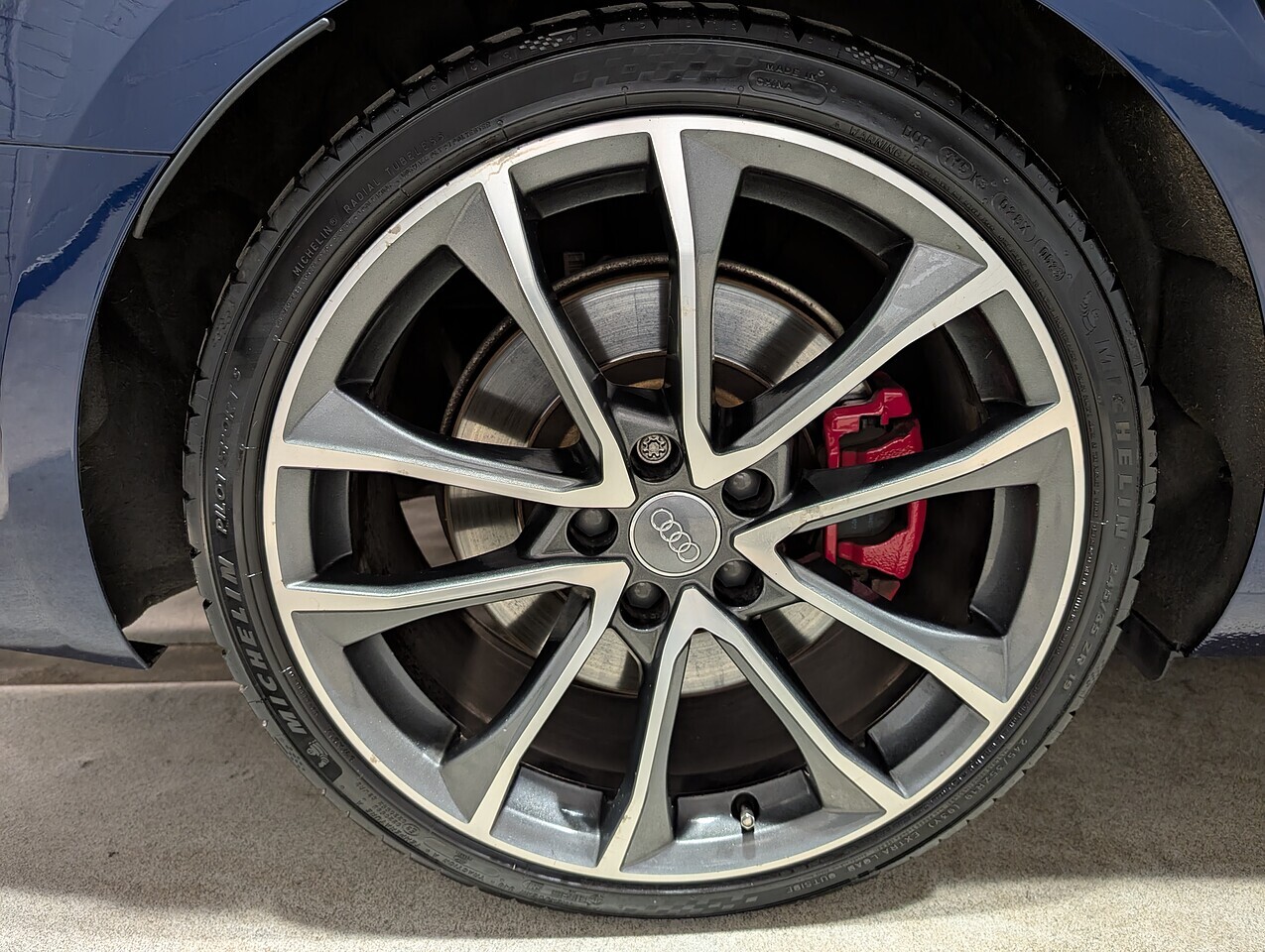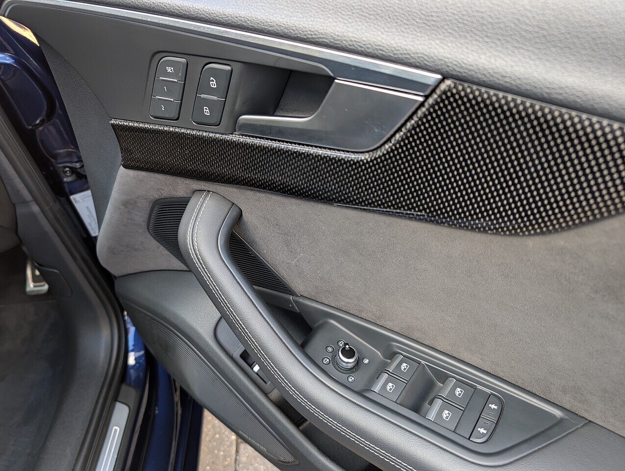 Panoramic glass sunroof, quattro with sporet differential, Sport suspension with damper control, Comfort & sound pack, Light & vision pack, Navarra blue metallic paint, Full black diamond stitched leather interior, Electric front seats with memory for driver, Electric folding & dimming door mirrors with memory, Bang & Olufsen speaker upgrade, Keyless entry & starting, Reversing camera, Virtual cockpit, Matrix LED headlamps, Extended LED ambient lighting pack, Gloss black styling pack, 19" 5-spoke V design alloy wheels, Privacy glass, Carbon atlas interior inlays, Red brake calipers, Storage pack.