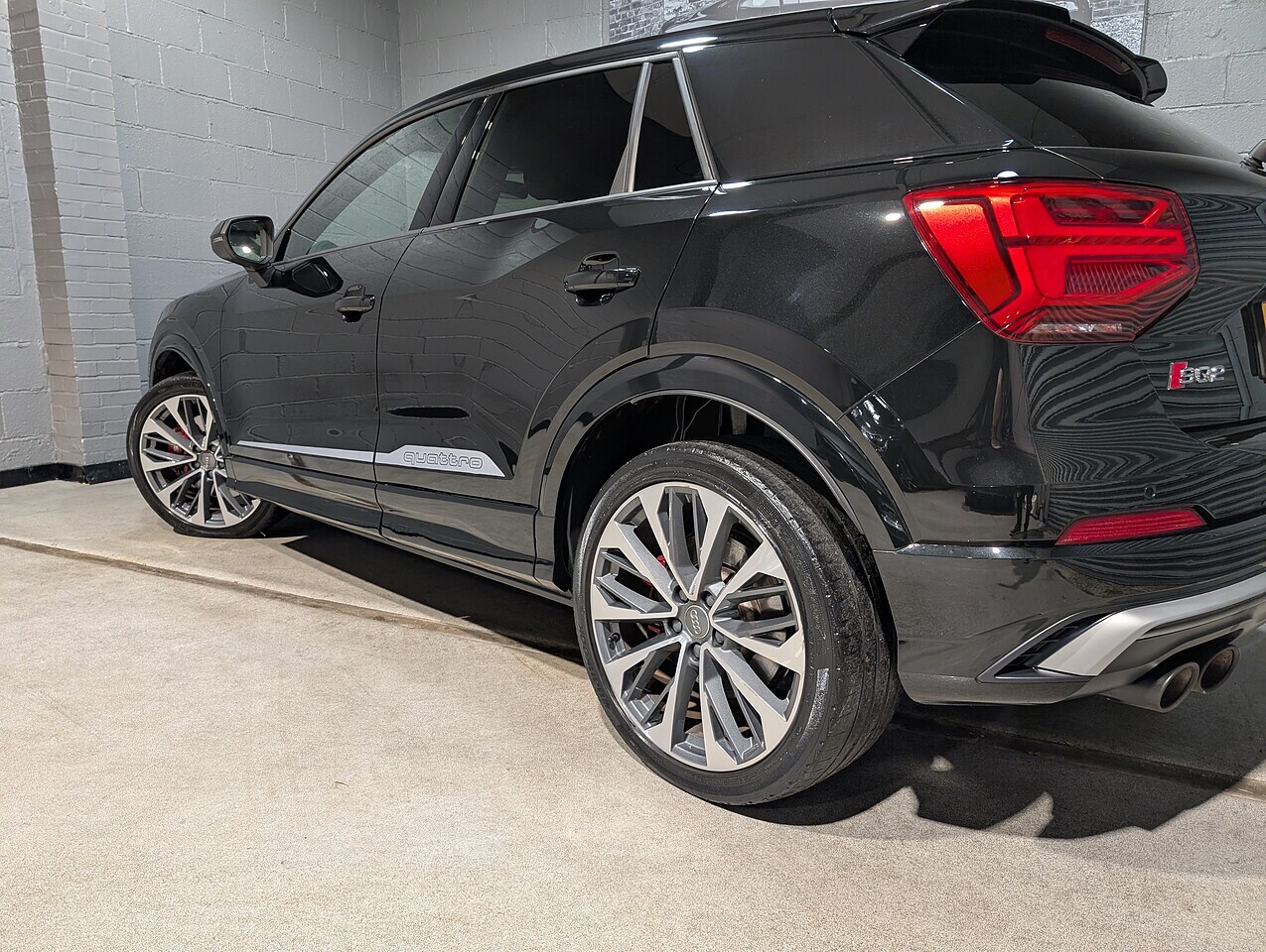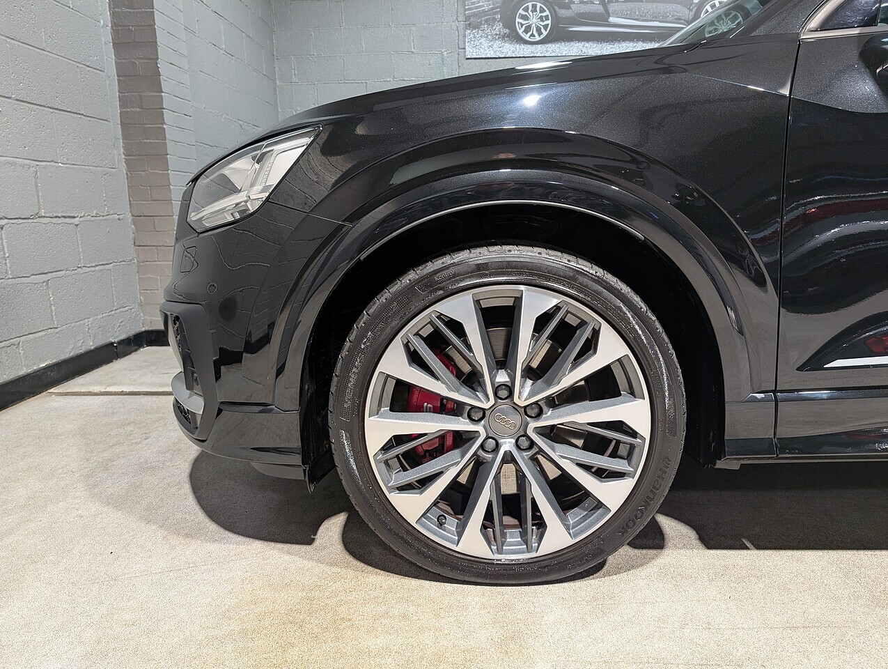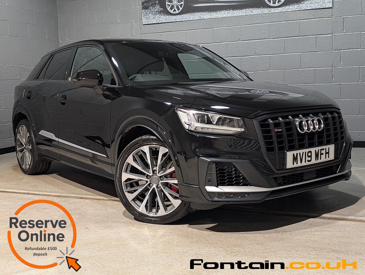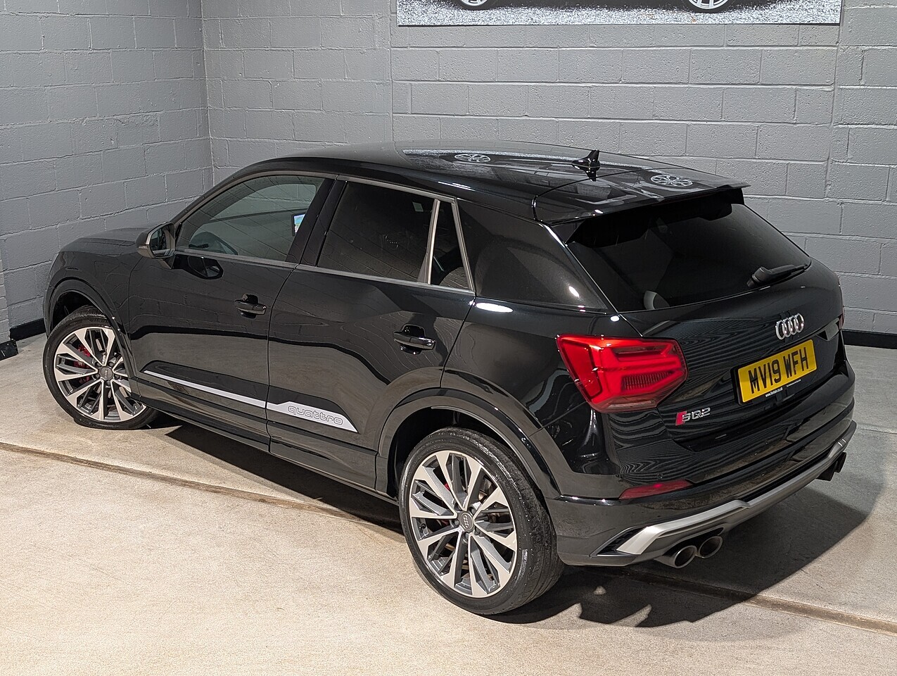 Technology pack, SQ2 exterior pack, Virtual cockpit, Bang & Olufsen speaker upgrade, Reversing camera, Mythos black metallic paint, Black leather interior with Alcantara centres, Red brake calipers, Flat bottomed steering wheel, 19" 5-double-spoke V-style alloy wheels, Heated front seats, Gloss black styling pack, Electric folding & dimming door mirrors, MMI satellite navigation plus, Parking system plus, Cruise control, Hold assist, Privacy glass.